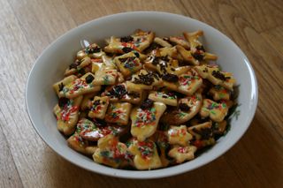 - Die Plätzchen mit Eigelb bestreichen und mit Streuseln und Rosinen belegen.
